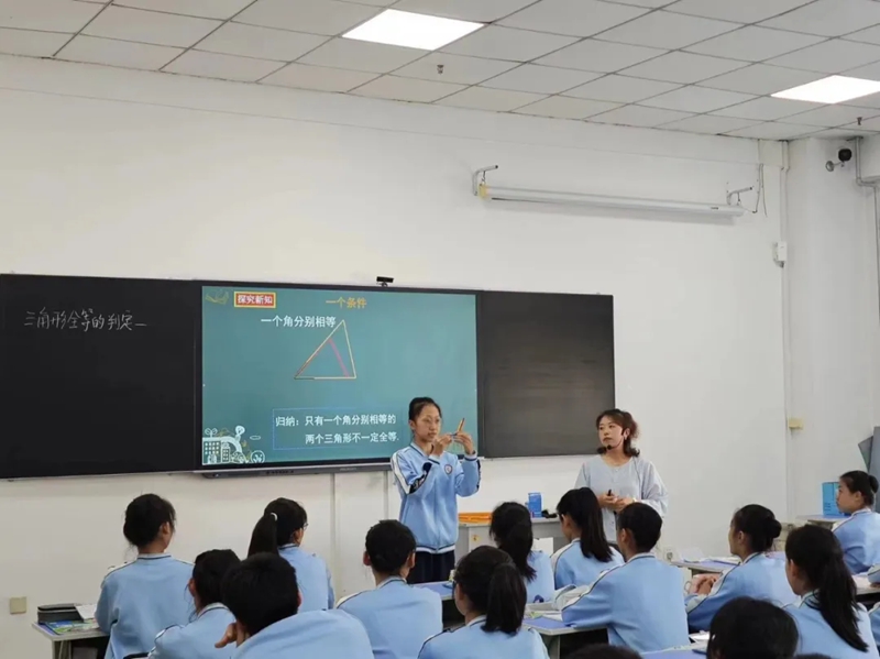 思政部杨扬老师进行七年级下Unit 10 I’d like some noodles英语课教学展示。课程设计用心用情,创意视频和游戏闯关激发了学生的学习兴趣,精心布置的点餐场景锻炼了学生在真实情境下的口语表达,巧妙创设的哈尔滨亚冬会主题培养了学生的国际视野和中国情怀,寓教于乐,融学于趣,化教于心,让学生们感受书本的温度、超越学科的高度、探寻文化的深度。尹睿老师的《三角形全等的判定一》数学课教学展示,以学生们整齐欢快的手势舞开始,用启发式的问题互动,培养了学生的数学思维,以三角板等工具的探究学习,营造了良好的沉浸式氛围,进一步深化学生对知识的理解和应用,巩固整节课的教学目标,达成良好的教学效果。