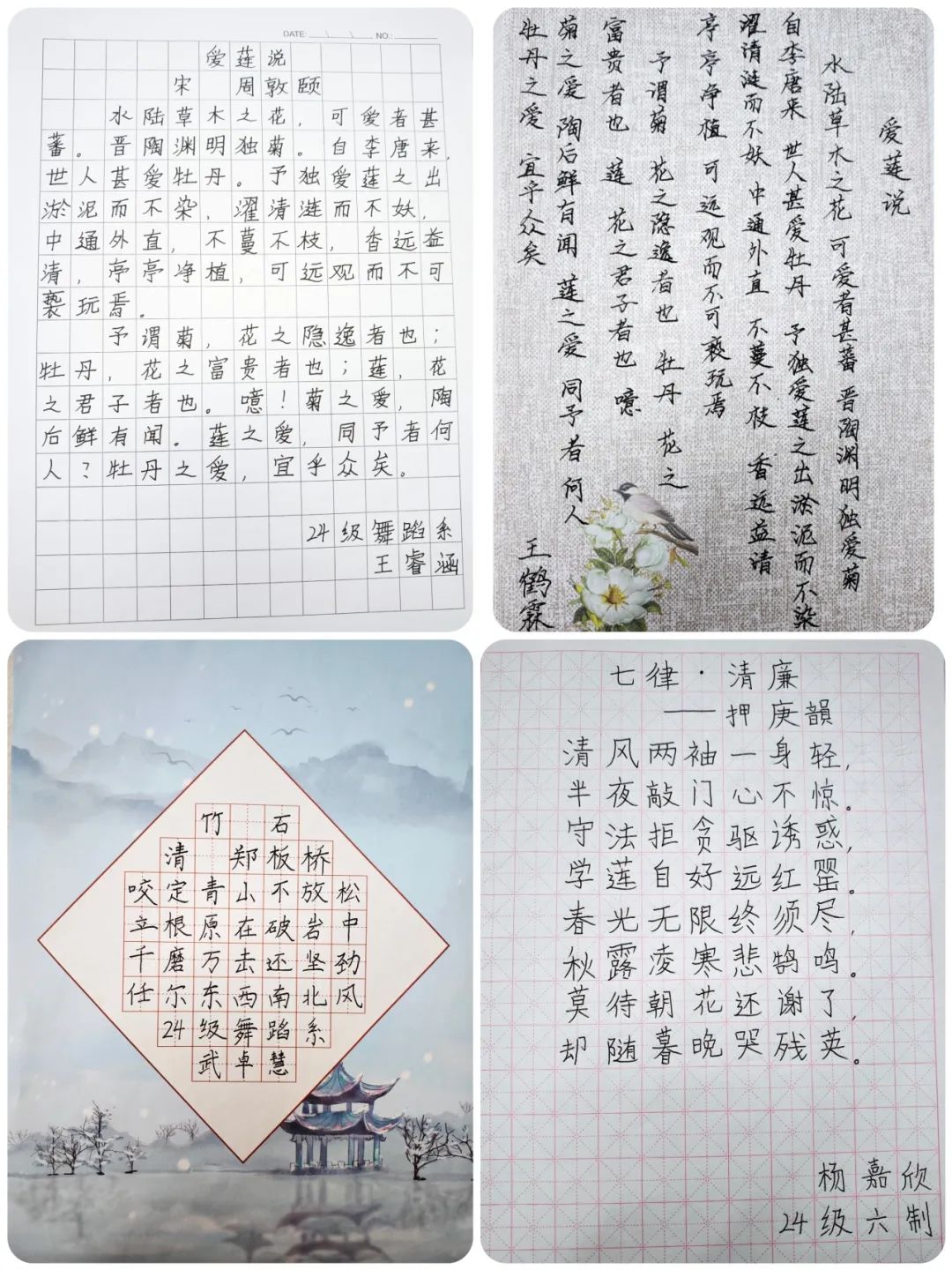 “历览前贤国与家,成由勤俭破由奢。同学们从语文老师推荐的众多清廉古诗词中精心选取内容,如李商隐的《咏史》、包拯的《书端州郡齐璧》、于谦的《石灰吟》等,这些经典之作不仅让学生领略了古人的廉洁智慧,更在书写中传承了清廉文化。学生们的作品,笔画流畅,刚劲有力,结构匀称,不仅展示了他们的书法功底,还体现出他们对汉字书写的严谨态度。一句句传递廉洁文化的格言警句,一幅幅呈现清廉奉公的书法作品,彰显了校园崇尚清廉的境界和一心守廉的本色。