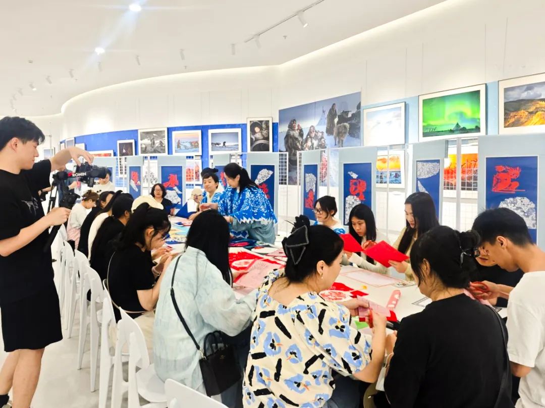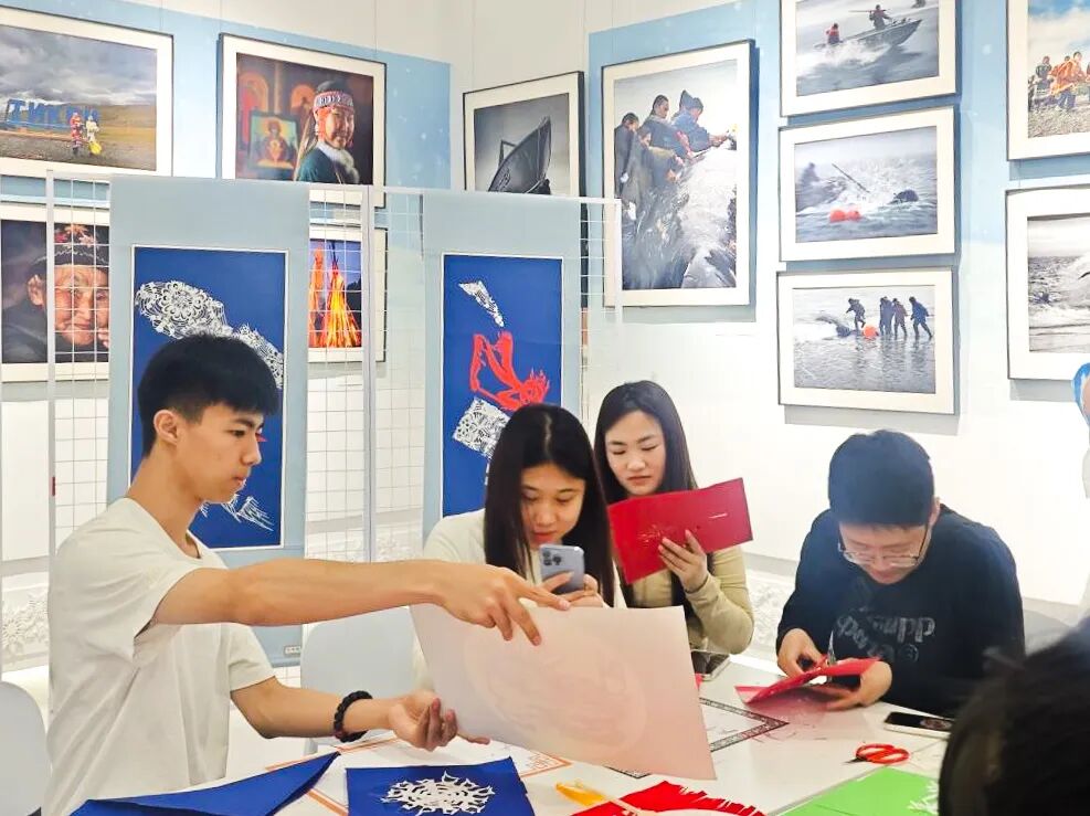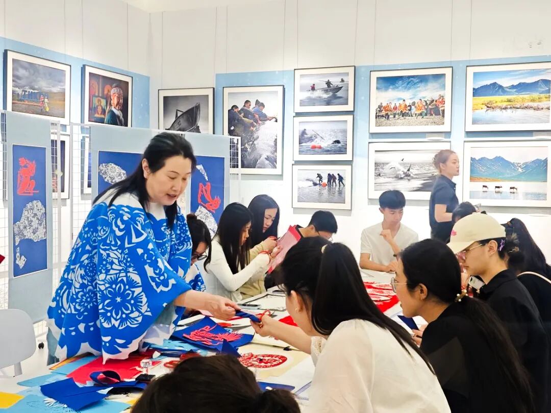 艺术教育系民族传统技艺专业学生组成研学授课团队,成员们不仅在大师指导下完成创作,更主动承担起现场教学任务 —— 通过分步示范、一对一指导,带领参观游客体验冰雪剪纸的折叠技巧与镂空刀法;结合龙江冰雪文化与剪纸非遗历史,生动讲解每幅作品的创作理念与文化寓意,成为展览中 “会讲解、能示范、善传播” 的非遗传承小导师。