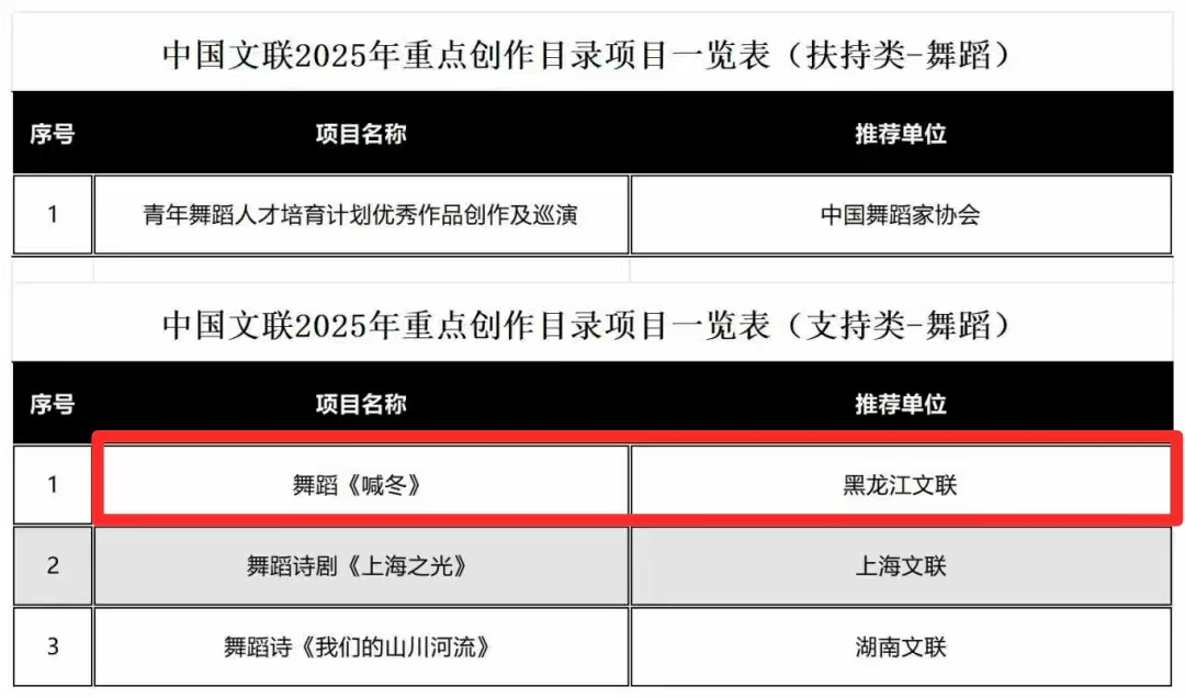 舞蹈创作聚焦于龙江地域特色,通过丰富多样、富有张力的舞蹈语汇,将龙江独特的冰雪文化与具有深厚历史底蕴和伟大精神的北大荒精神进行深度融合,全方位、多角度地展现北方人民在严寒的自然环境中,所具备的坚定不移、百折不挠的意志品质,以及始终保持积极向上、乐观豁达的生活态度,项目计划于2025年创排完成。舞蹈《喊冬》不仅是一场视觉与心灵的双重洗礼,更是以舞蹈为媒介进行了一次中华优秀传统文化的深度传播,为龙江冰雪经济的发展注入源源不断的文化动能,努力实现艺术创作与地方经济发展的和谐共鸣、同频共振。